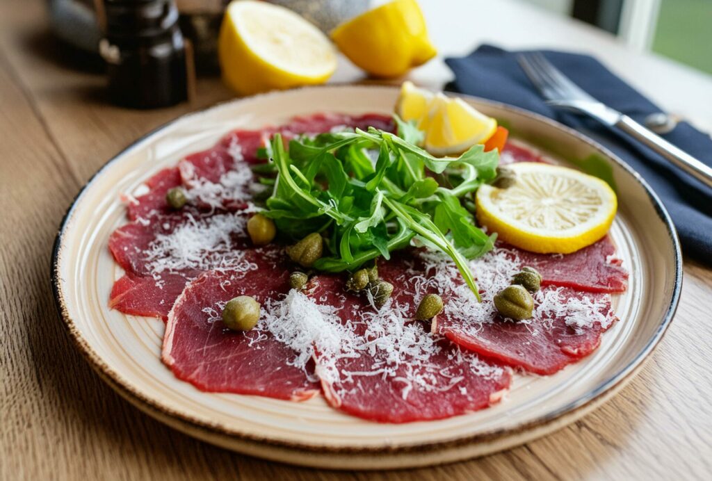 Carpaccio de Boeuf, Huile de Roquette Basilic, copeaux de parmesan 22€